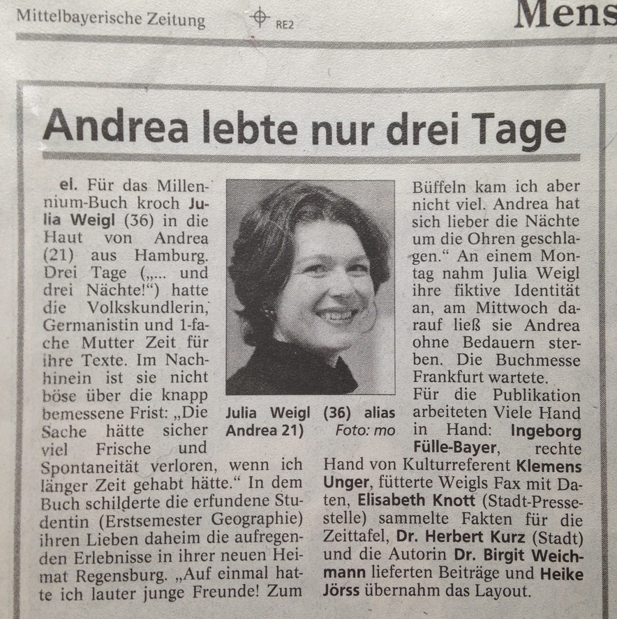 Vor einem Vierteljahrhundert erlebte ich die kürzeste Schreibzeit für ein dickes Buch . Unter dem Titel „So war’s – Regensburg 2000“ sollte ein großformatiger Bildband an unzählige Veranstaltungen, Kunstausstellungen, Konzerte, Weinproben und Sportevents erinnern. Ich ließ Andrea, Studentin aus Hamburg, über das große Regensburgjahr 2000 staunen und erzählen. Ihre Begeisterung über die Stadt, die heute zum UNESCO Weltkulturerbe der Menschheit gehört, sollte sie in Briefen, Postkarten, Tagebucheinträgen und E-Mails so richtig ausleben können.