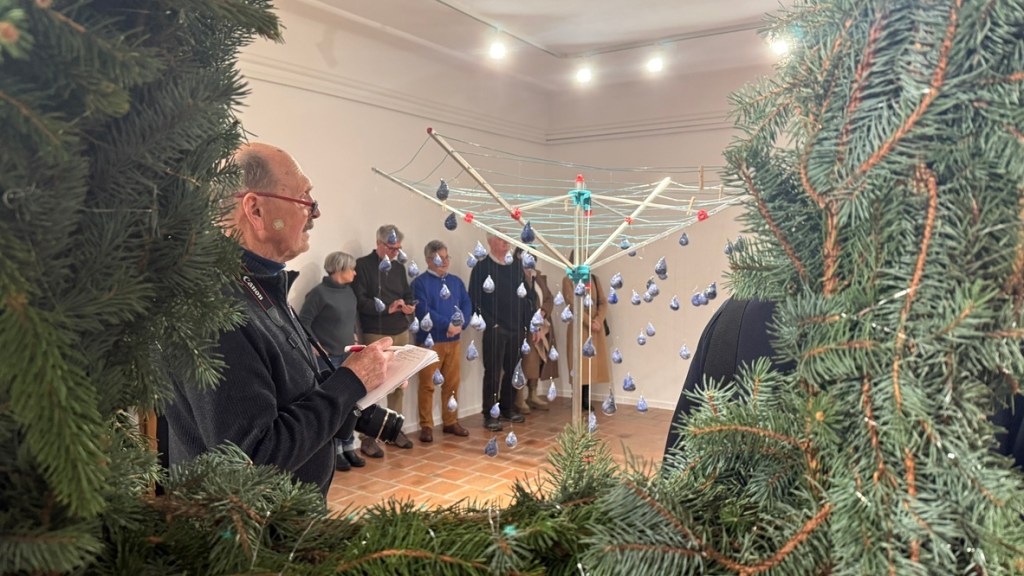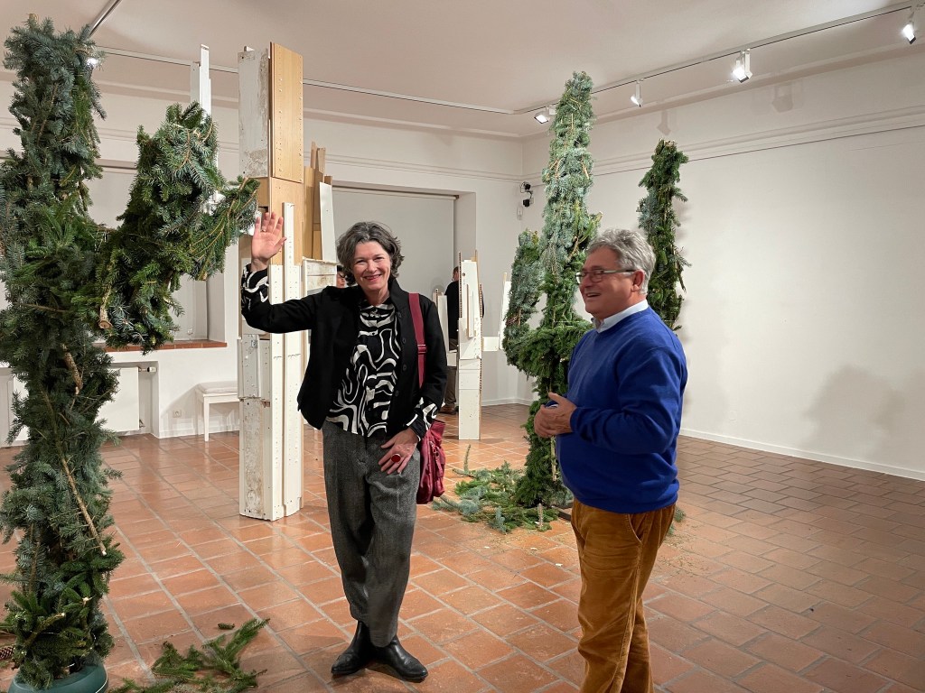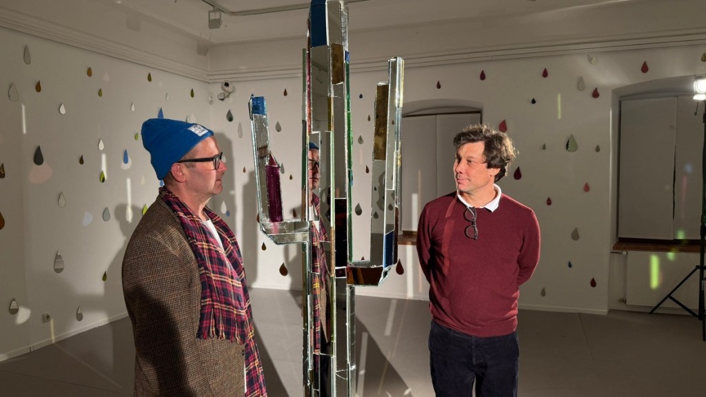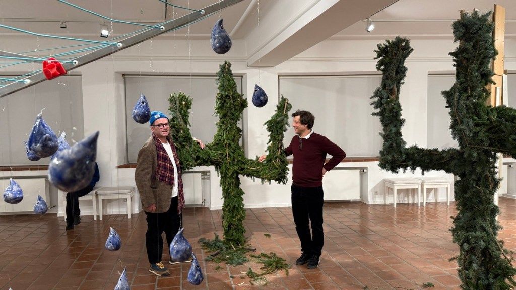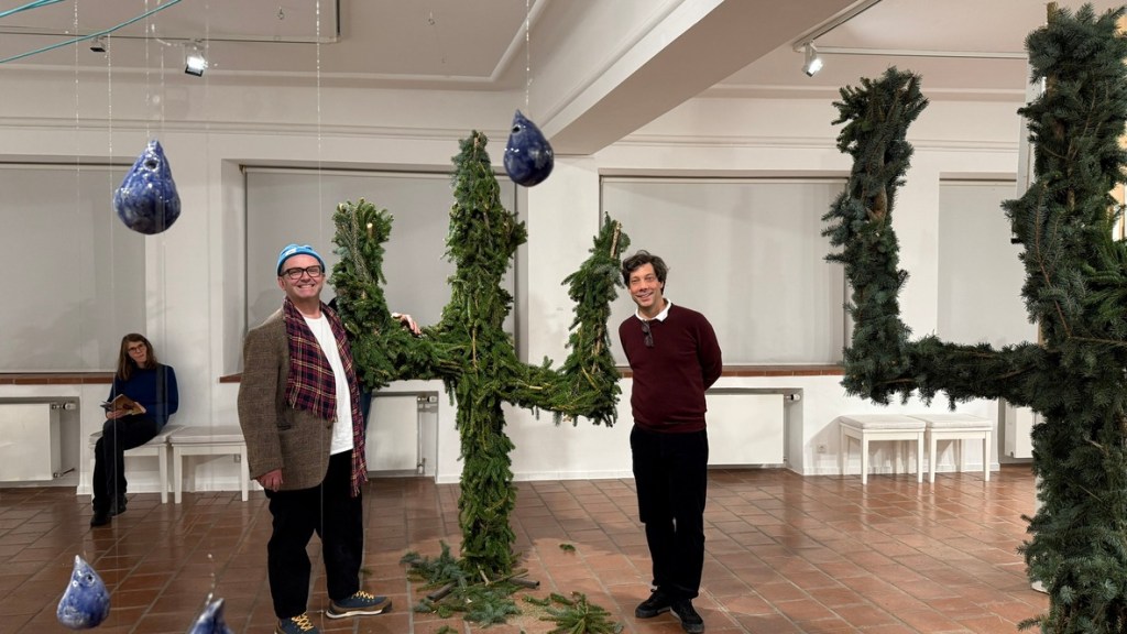 Torsten Mühlbach und Gregor Passens arbeiten seit 2021 zusammen. Sie sind bekannt für ihren spielerischen Umgang mit bereits verwendetem Material – bislang vor allem Spiegelglasreste und Keramik. In der Städtischen Galerie Cordonhaus kommen nun auch Reste aus dem Weihnachtsbaumverkauf hinzu. Zeitgleich zeigt das Duo am Eingang des Münchner Tollwood-Festivals eine aus Spiegelfragmenten zusammengesetzte, sechs Meter hohe Friedenstaube.