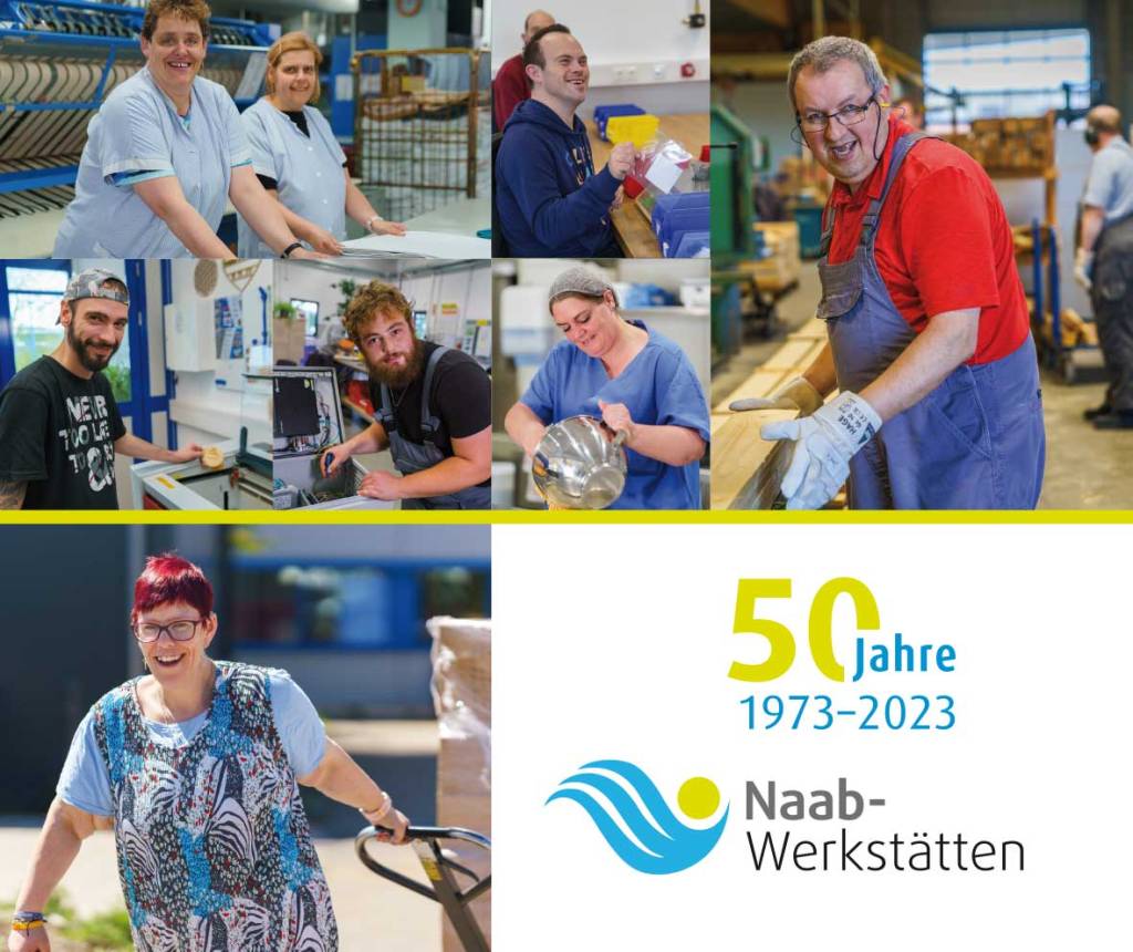 Menschen mit und ohne Behinderung begegnen sich seit 50 Jahren in den Naab-Werkstätten im Schwandorfer Stadtteil Ettmannsdorf. In Wäscherei, Schreinerei, Montage, Fahrradwerkstatt, Kantine und vielen anderen Abteilungen arbeiten 600 Menschen mit- und füreinander. Jetzt zeigt eine 58-seitige Broschüre in Text, Bild und Grafik wie diese Zusammenarbeit tagtäglich auf’s Neue gelingt.