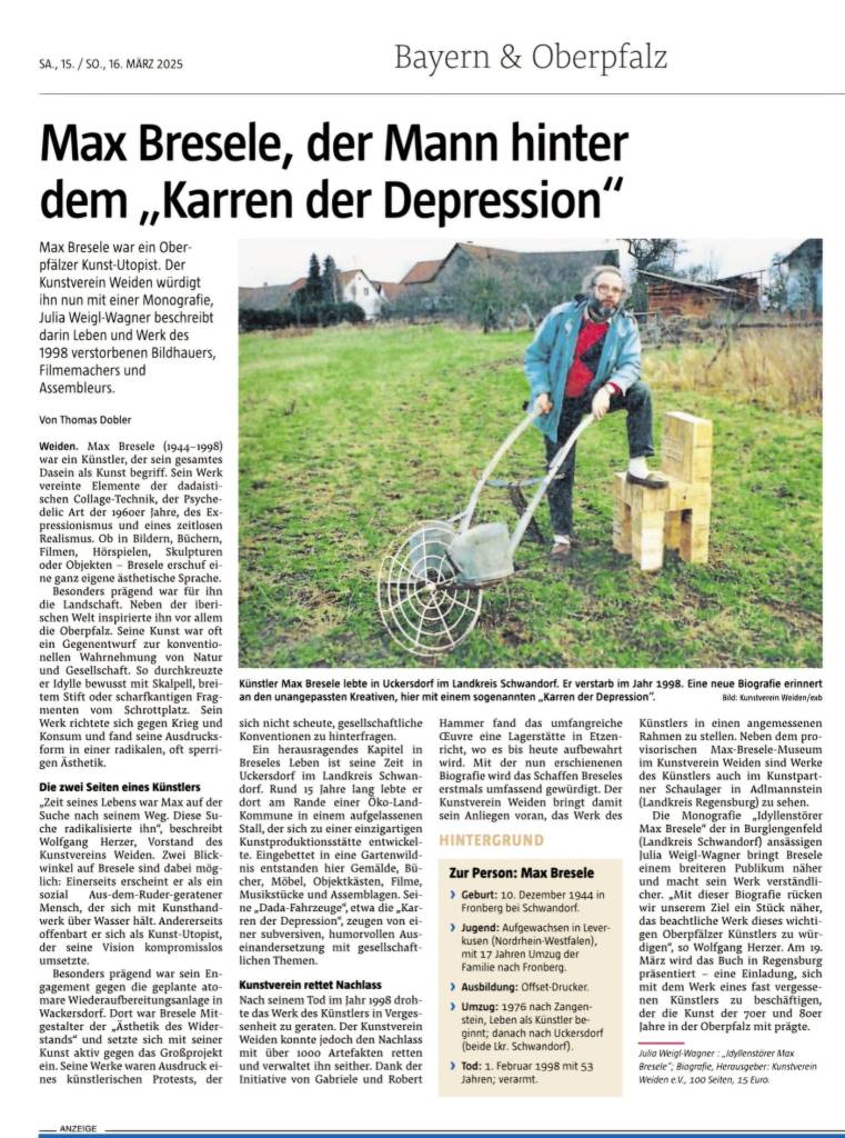 Julia Weigl-Wagner: Idyllenstörer Max Bresele, hrsg. v. Kunstverein Weiden e.V., 2025 – 104 Seiten mit Abbildungen als E-Book 7,99 Euro (ISBN 978-3-00081-665-9) und als Paperback 14,99 Euro (ISBN 978-3-384-533665-9) – zu beziehen über den Kunstverein Weiden e.V., ledererstraße 6, 92637 Weiden, Telefon 0151 61481710